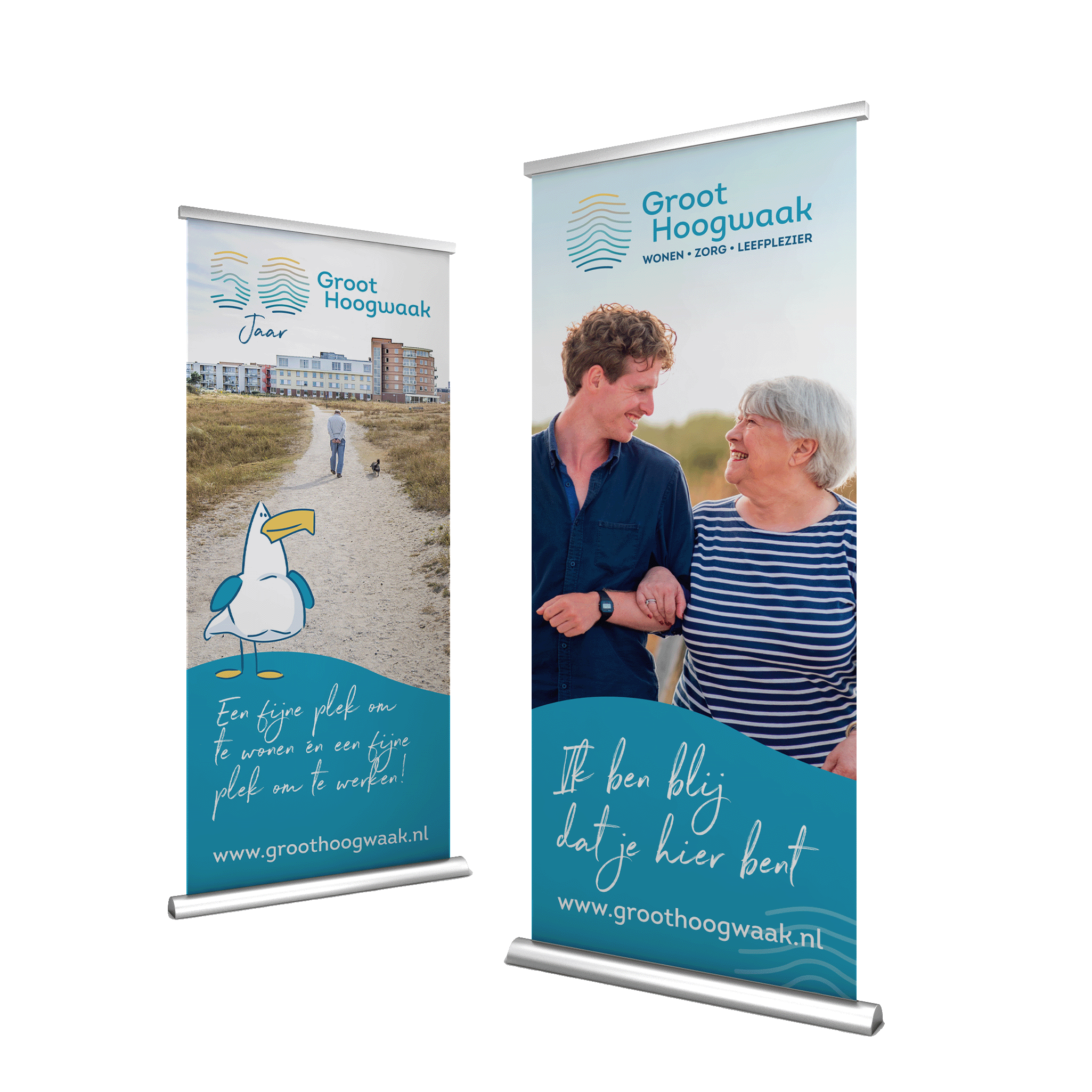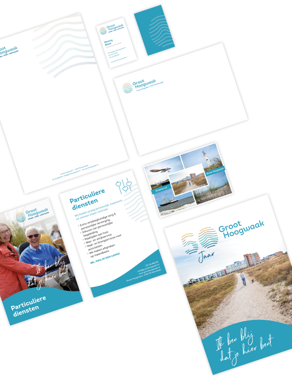 Voor het ontwikkelen van de nieuwe visuele identiteit zijn we gestart met een aantal sessies waarbij de klant centraal stond en we de identiteit scherp hebben geformuleerd. De uitkomst was helder: iedereen is uniek, heeft een eigen zorgaanpak nodig en heeft een eigen kijk op de wereld. Dit resulteerde in de visuele identiteit rondom de vingerafdruk, die iedereen uniek maakt. Tevens is de bijzondere locatie van Groot Hoogwaak hierin terug te zien: de zon, golven en de duinen. De slogan ‘Ik ben blij dat je hier bent’, zet het geheel extra kracht bij.