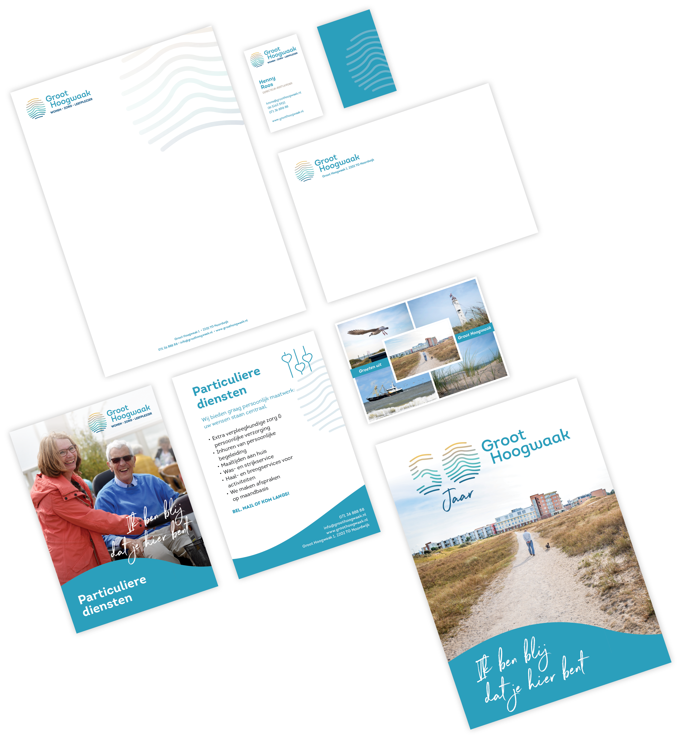 Binnen de visuele identiteit is ook het fotografieconcept ontwikkeld met de daarbij horende campagnebeelden in Noordwijk. Een serie waarin interactie tussen mensen die elkaar lief zijn worden afgewisseld met indringende portretten waar het levensgeluk vanaf spat. De basiselementen zijn vastgelegd in het brandbook, en daarnaast hebben we de rest van de communicatiemiddelen ontwikkeld, zoals stationary, wagenpark, outdoor design, drukwerk en de website.