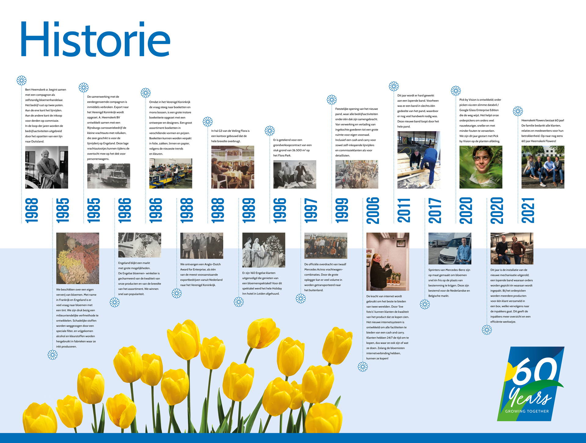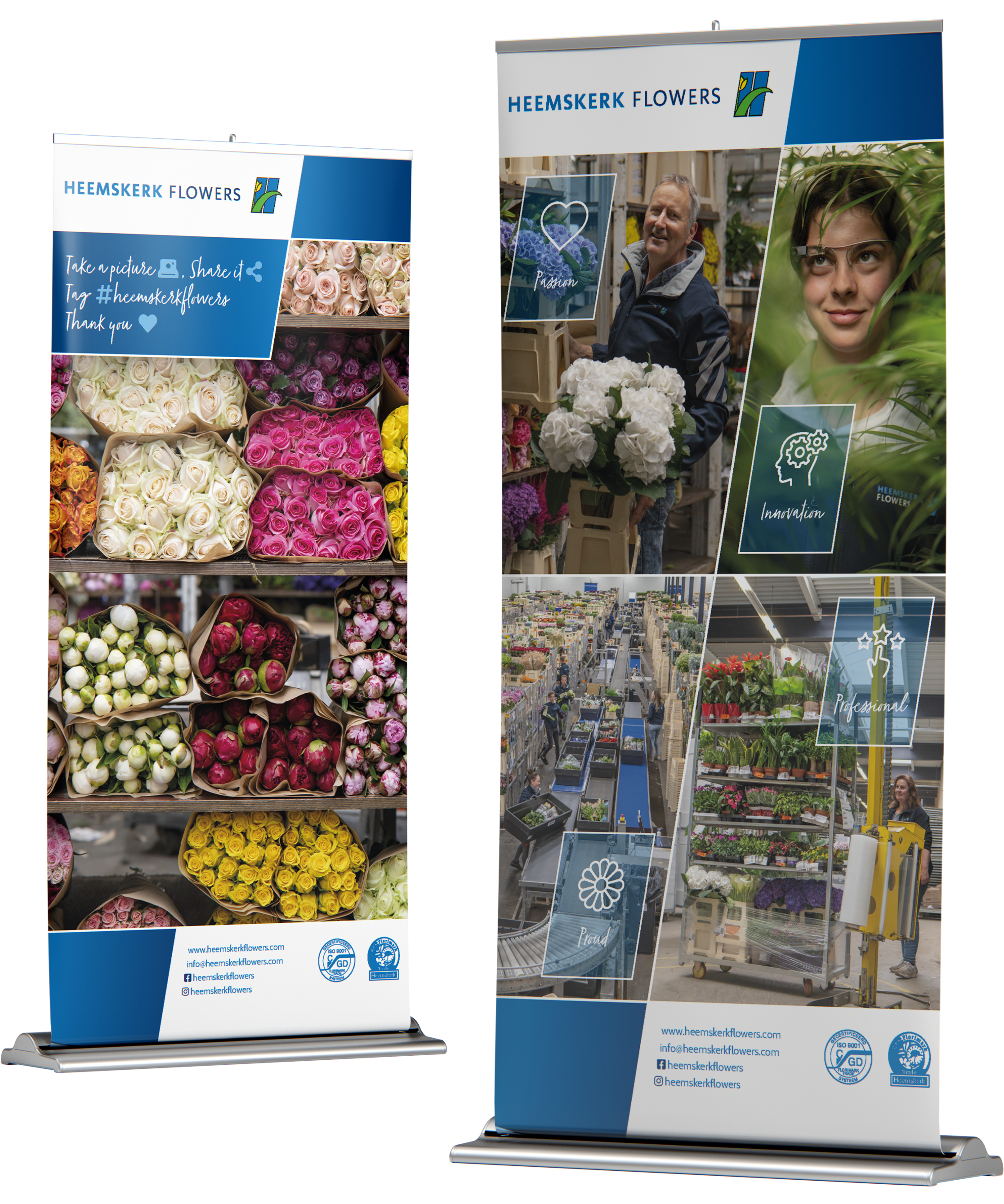 Inmiddels maken wij diverse communicatiemiddelen voor Heemskerk Flowers: een mooie tijdlijnvisual in het pand, posters, advertenties, roll-up banners en beursstands.