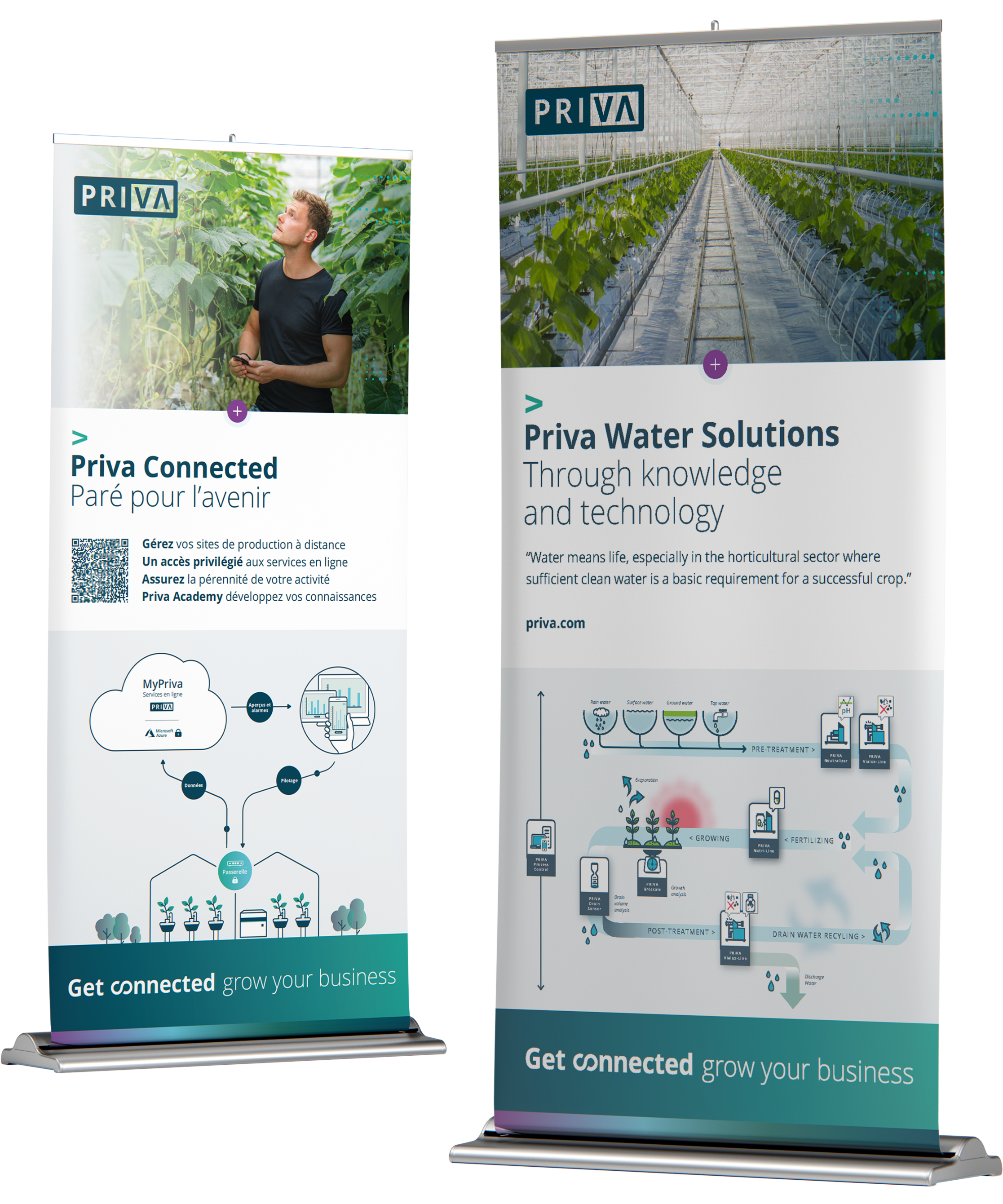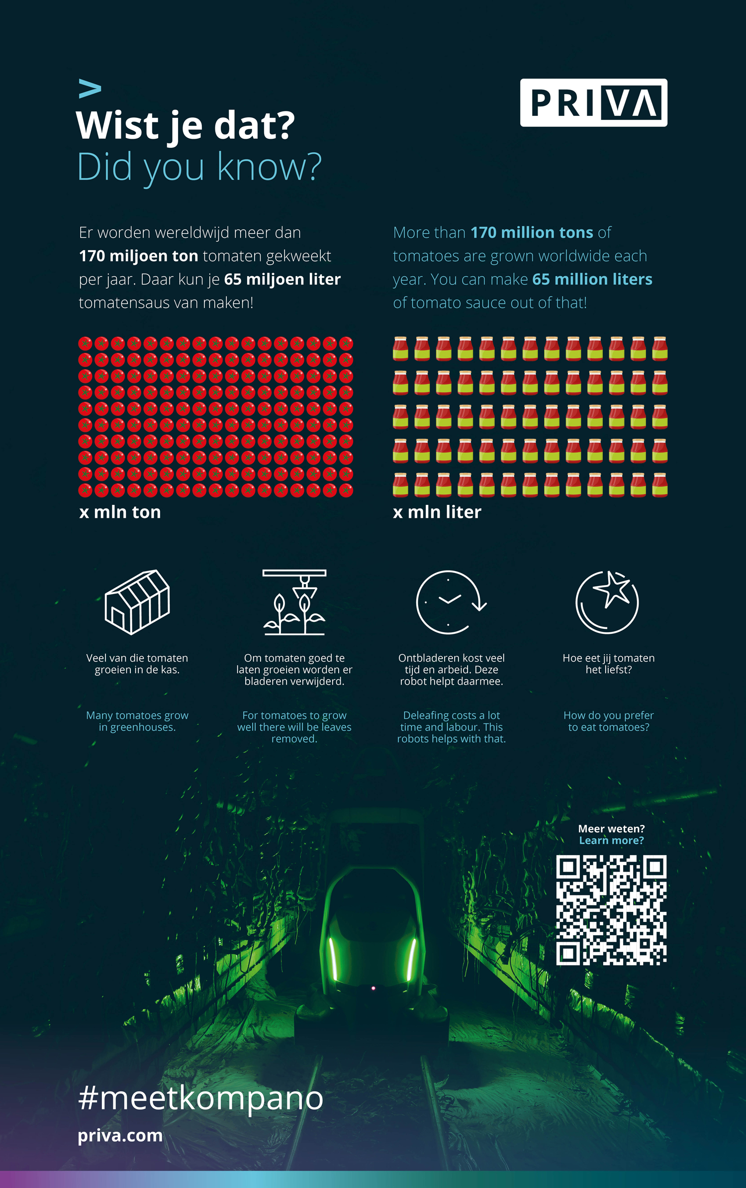 We ontwikkelen diverse infographics voor Priva, deze zijn veelal bedoelt voor online gebruik of drukwerk. Daarnaast komen de infographics op diverse beurswanden terug: Priva staat op veel internationale beurzen en inmiddels hebben onze wanden Brazilië, Canada en de USA bereikt. Naast beurswanden ontwerpen we regelmatig advertenties en ander drukwerk, zoals roll-up banners, factsheets en brochures.