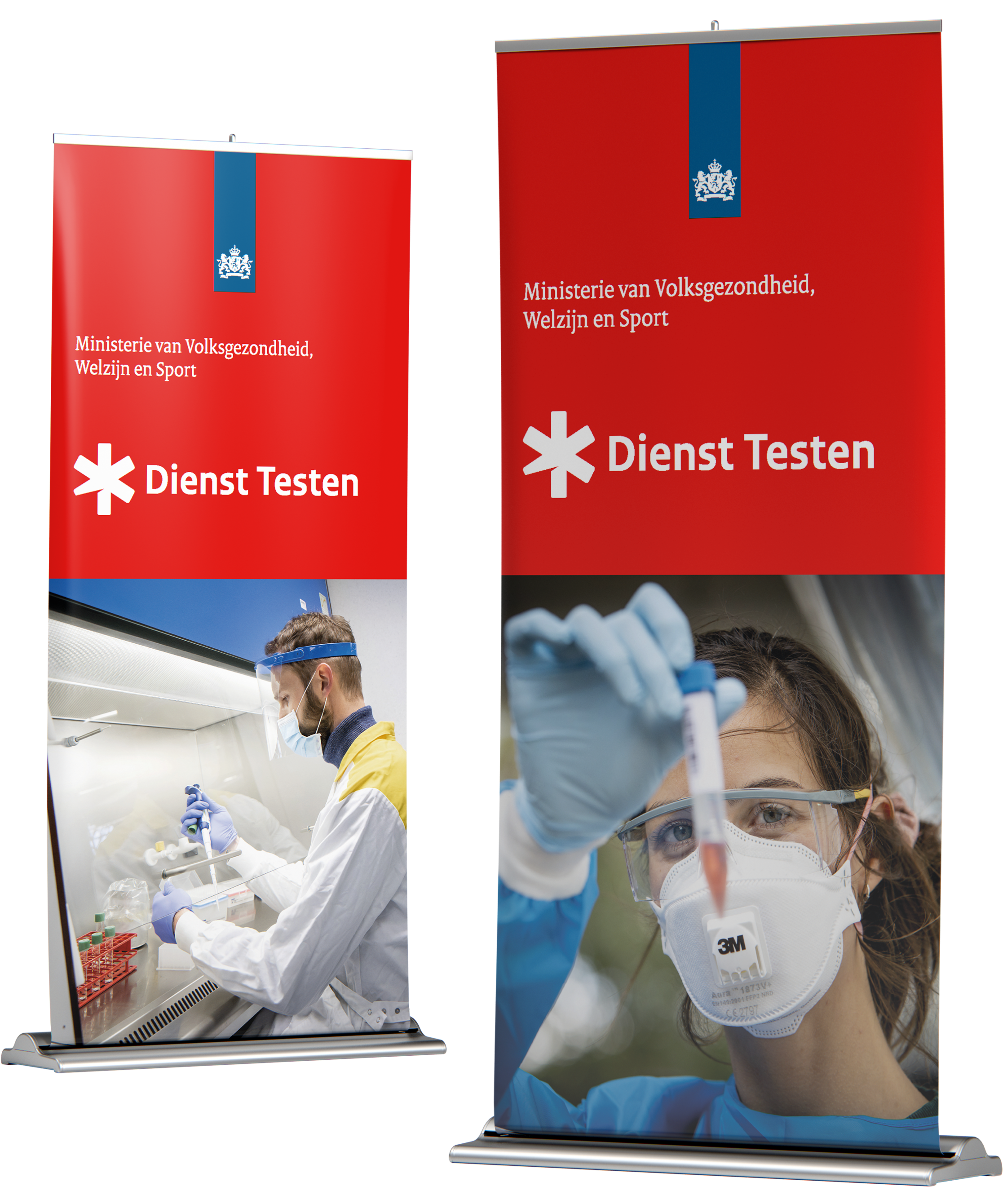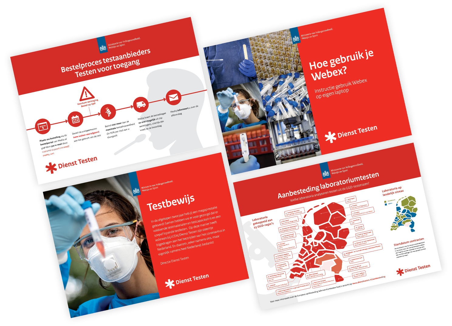 Een ander thema van de laatste jaren is Covid-19. Voor het onderdeel Dienst Testen ontwikkelden wij infographics en icons, om processen in kaart te brengen en uitleg te geven aan diverse partijen. Daarnaast maken we voor de interne organisatie een wekelijkse nieuwsbrief en ontwikkelen we divers drukwerk, zoals ansichtkaarten, roll-up banners, posters en certificaten.