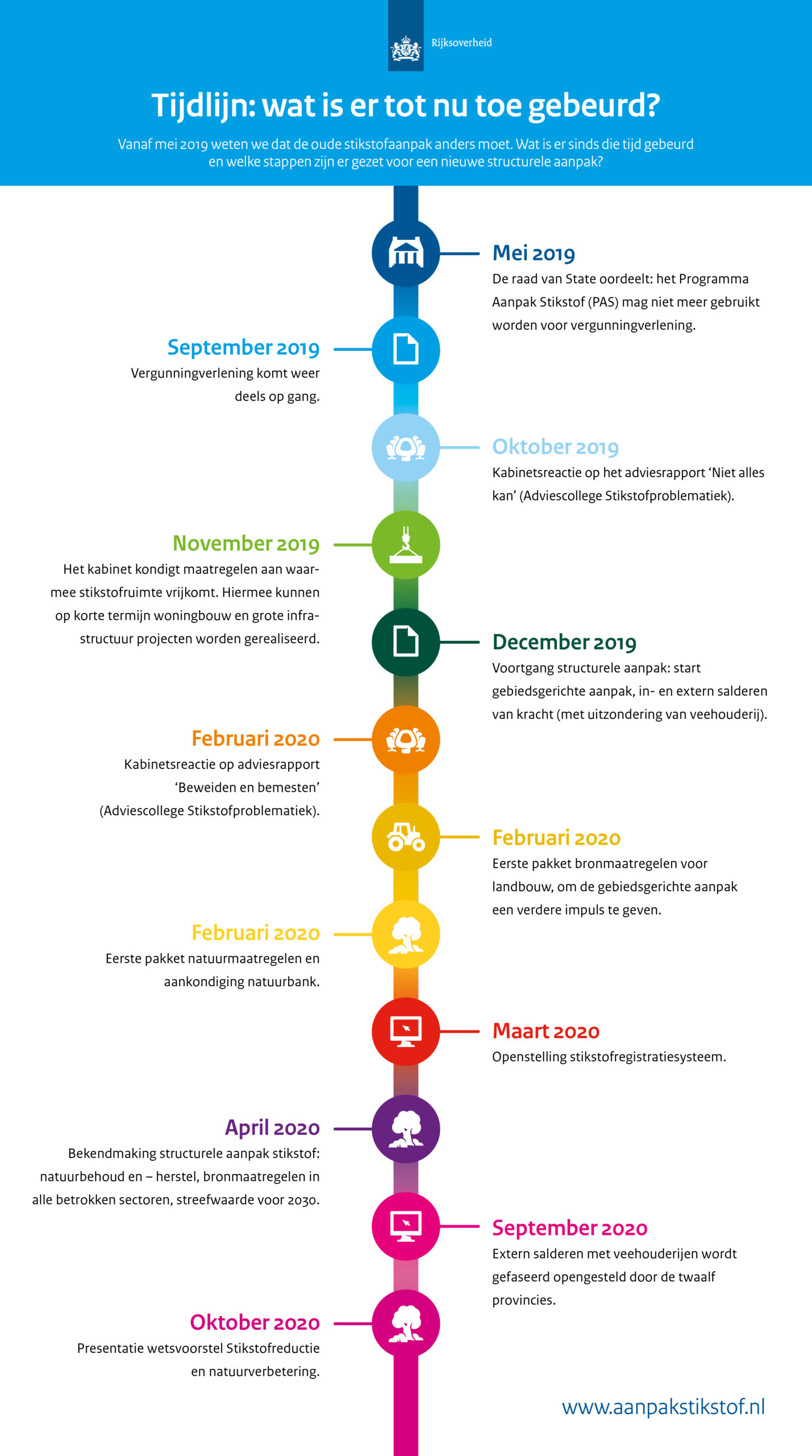 Voor de Rijksoverheid maken wij diverse infographics rondom het thema Stikstof: dit is al een aantal jaren een omstreden thema., Juist om die reden is er behoefte aan versimpeling van de materie en uitleg richting raadsleden en burgers. Naast de dikke rapporten, maken wij regelmatig infographics van de samenvattingen. Denk hierbij aan de laatste besluiten of tijdlijnen van processen.