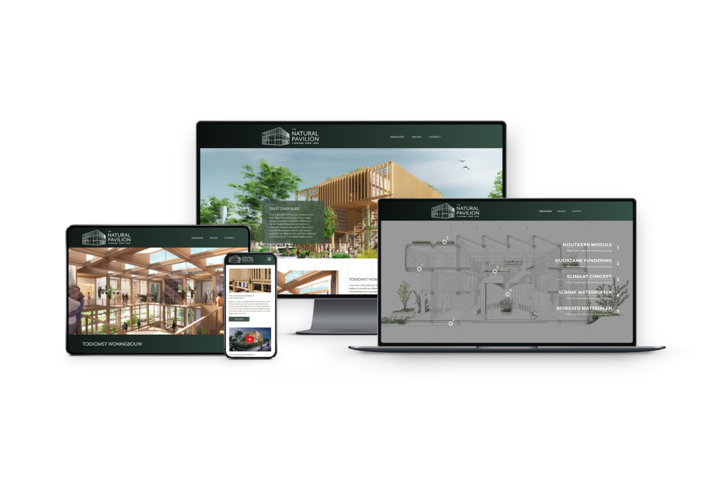 Het uitgangspunt voor het ontwerpen van de visuele identiteit voor The Naturel Pavilion is het prachtige paviljoen zelf. Een grafische weergave van dit modulaire gebouw in beeld- en woordmerk, vormt een helder en minimalistisch geheel welke naadloos aansluit bij het paviljoen. Het kleurenpalet is gebaseerd op de natuurlijke elementen van het gebouw. Met deze visuele basis hebben wij diverse middelen ontwikkeld voor het paviljoen, waaronder de website, brochures en een art-wall met infographics en informatie.